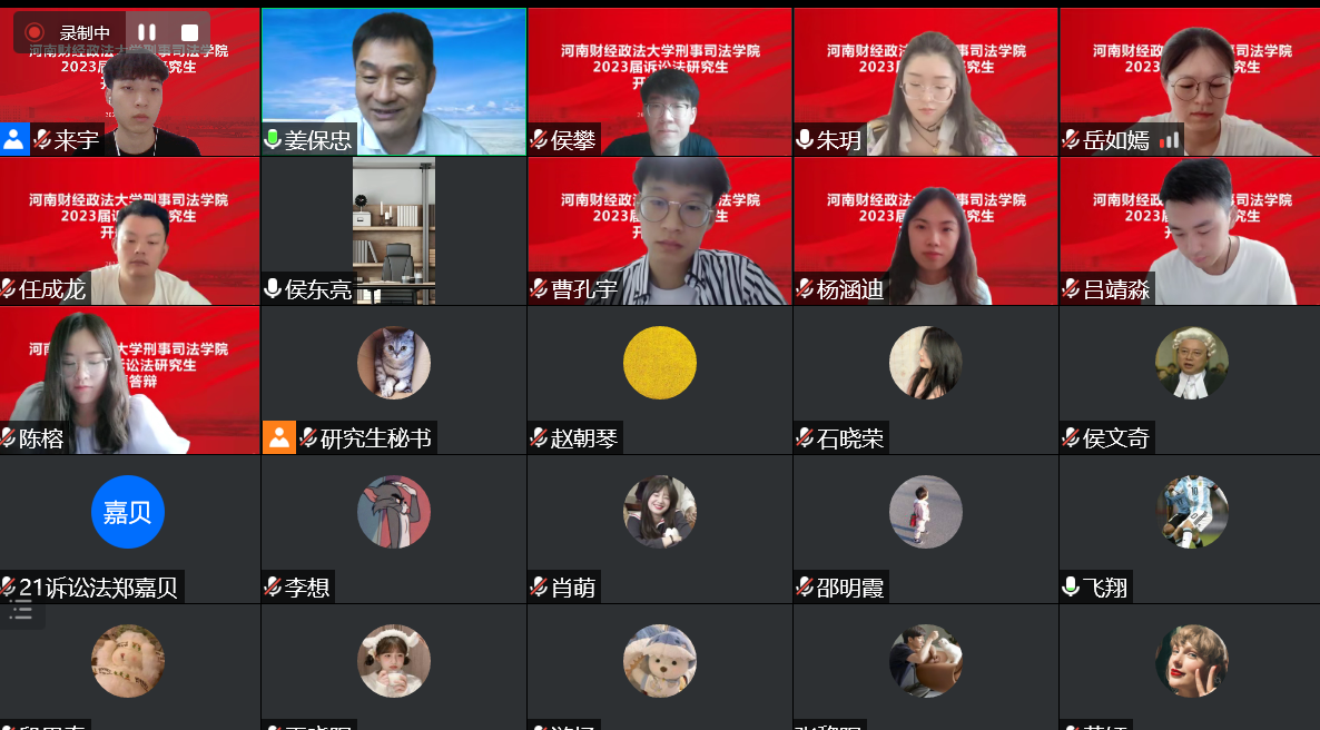 6月18日上午,我院举行2020级诉讼法专业硕士研究生学位论文开题答辩会。受疫情影响,本次开题答辩会以腾讯会议的方式举行。我院研究生秘书焦经川博士对开题答辩会做了精心准备和安排。我校诉讼法导师组华小鹏教授、姜保忠教授、赵朝琴教授、侯东亮副教授、张敬思副教授出席答辩会。