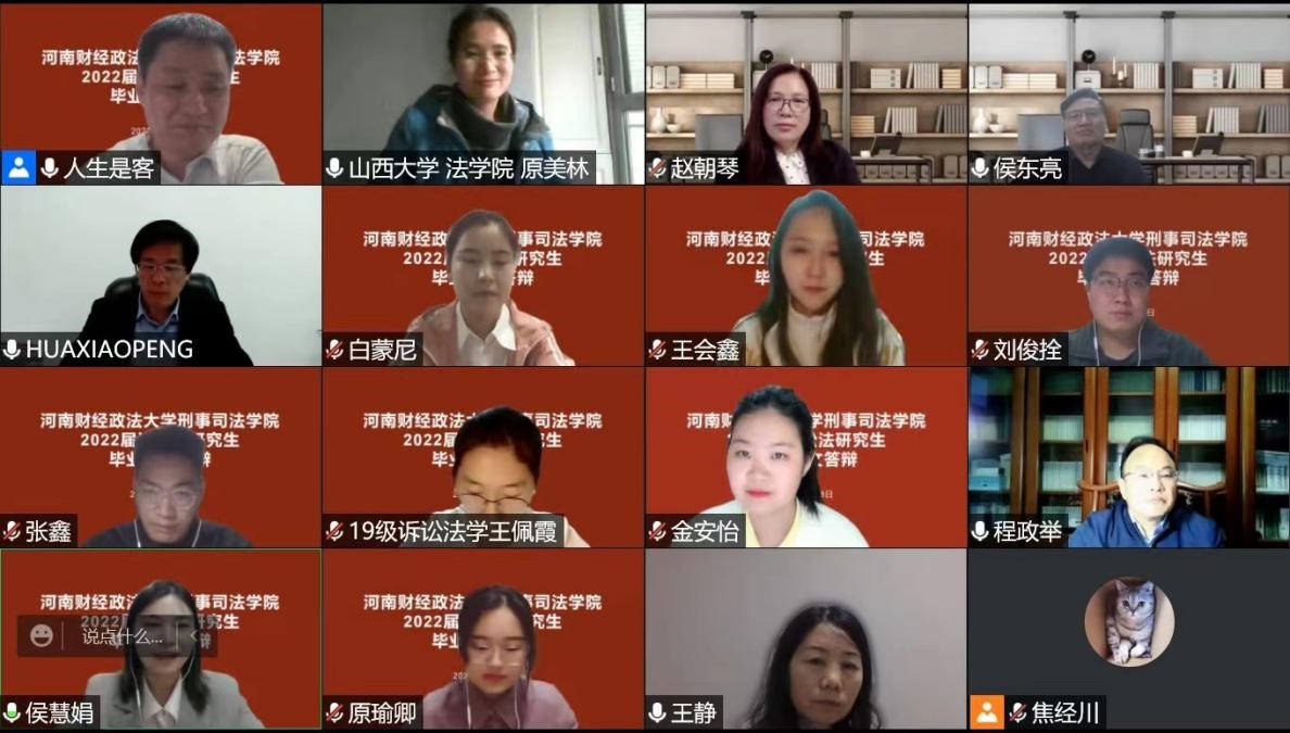 2022年5月8日,我院2022届诉讼法学硕士研究生学位论文答辩会顺利举行。根据疫情防控规定,本次答辩全程线上进行。本届诉讼法专业毕业研究生共8位,分别是白蒙尼、侯慧娟、王佩霞、金安怡、原瑜卿、王会鑫、张鑫、刘俊栓。参加答辩的8位同学前期已经顺利完成了论文的开题、写作、预答辩、学术不端检测、匿名评审等各项程序。本次答辩会邀请山西大学教授、博士生导师原美林担任答辩委员会主席。我院诉讼法导师组华小鹏教授、姜保忠教授、赵朝琴教授、程政举教授、侯东亮副教授、王合静副教授任答辩委员。我院全体诉讼法专业硕士研究生在线观摩学习。