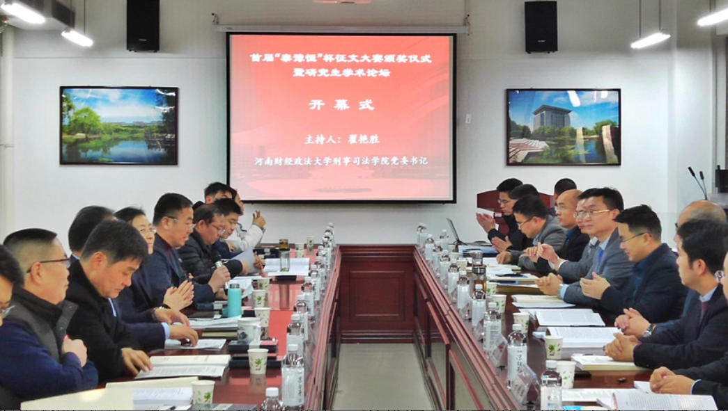 2020年12月13日上午,首届“泰豫恒”杯征文大赛颁奖仪式暨研究生学术论坛在我院504会议室隆重举行。河南泰豫恒律师事务所主任段学聪、党支部书记王海波、我校法学院院长王小红教授、我院党委书记翟艳胜、院长程政举教授、国际教育学院党委书记姜保忠教授、民商经济法学院副院长李嵩誉教授、学报编辑部副主编李富民副编审等领导以及来自河南泰豫恒律师事务所的律师、我校法学专业部分教师和研究生共60余人参加了会议。