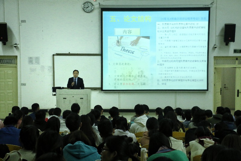 11月12日晚,我院于建树楼B101教室举办“法学学术论文写作”专题讲座。此次讲座由我院院长程政举教授主讲,我校英国威廉集团、法学院、民商经济法学院的本科生和研究生共计200余人聆听此次讲座。