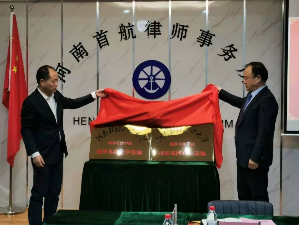 最后,郑州市律协副会长、河南首航律师事务所党支部书记田宏仓和我院程政举院长共同为“司法案例研究基地”和“校外教学实践基地”揭牌。