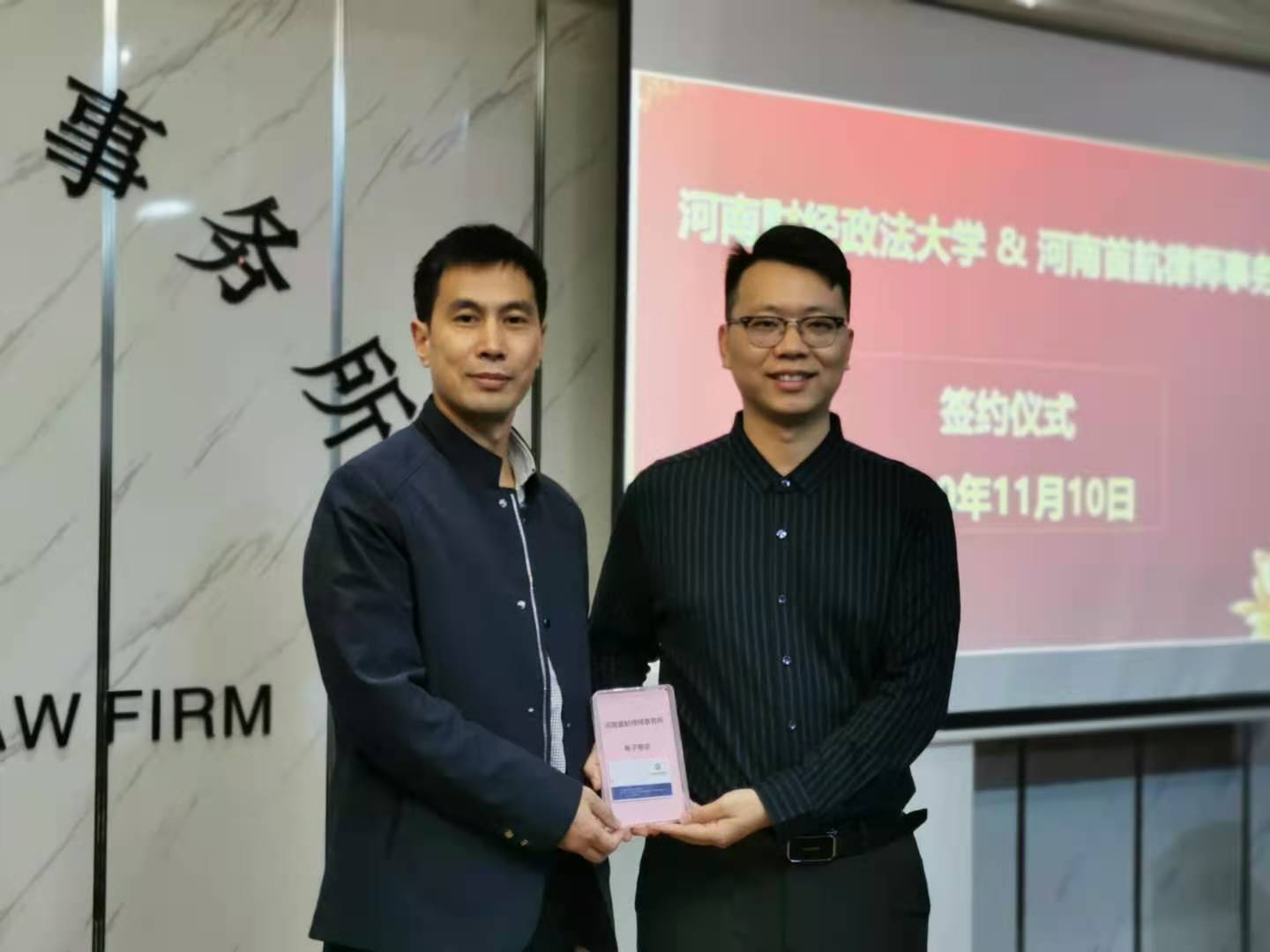 11月10日,我院与河南首航律师事务所签署了“司法案例研究基地”和“校外教学实践基地”合作协议,我院院长程政举教授、类案检索研究中心办公室主任朱贺博士、副主任焦经川博士参加了签约仪式暨揭牌仪式。
