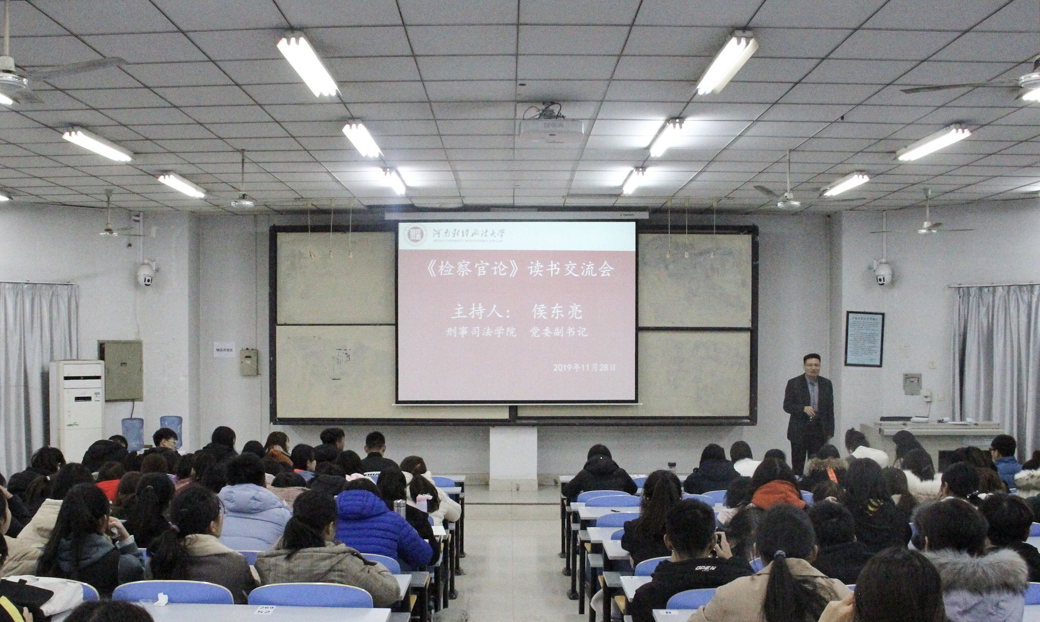 11月28日晚,文北校区十号教学楼阶梯二教室灯火通明,《检察官论》读书交流会在此举行。院党委副书记侯东亮主持大会,我校校友、省检察院第三检察部刘静检察官,辅导员孙仪娇,保研生代表闫敏、张宇涵应邀参加了读书活动。