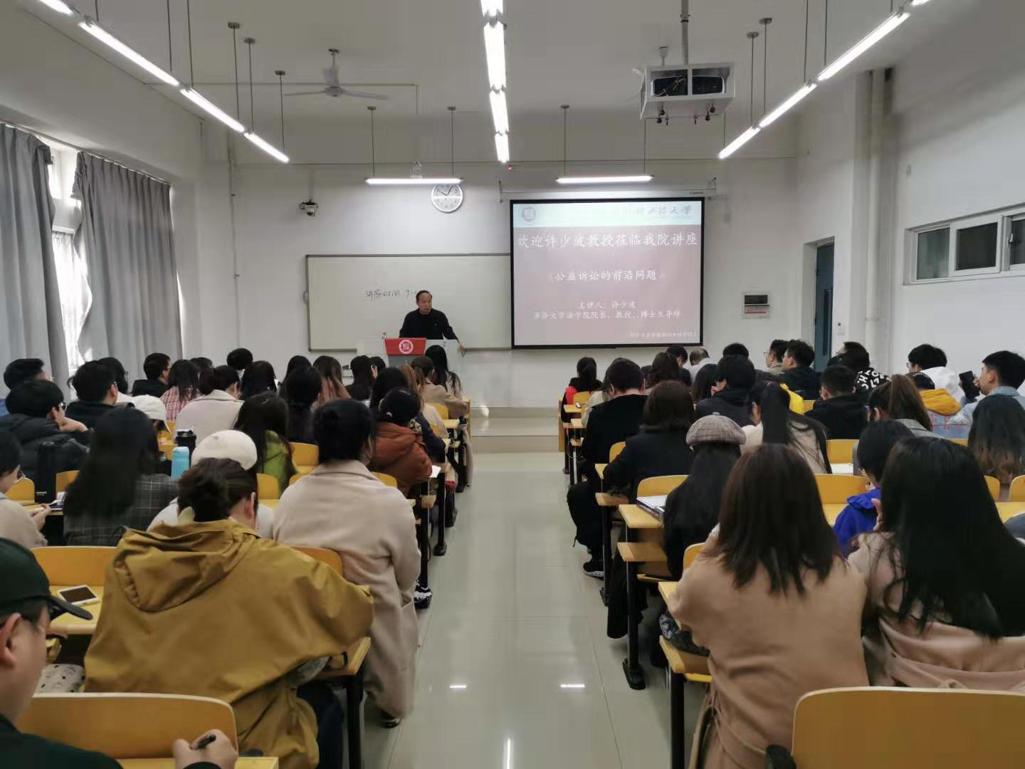 11月22日上午,华侨大学法学院院长、博士生导师许少波教授应邀为我院作题为《公益诉讼的前沿问题》的报告。我院硕士研究生导师侯东亮副教授和刘用军副教授出席活动,姜保忠教授担任此次活动的主持人,诉讼法学全体研究生、部分本科生参加此次活动。
