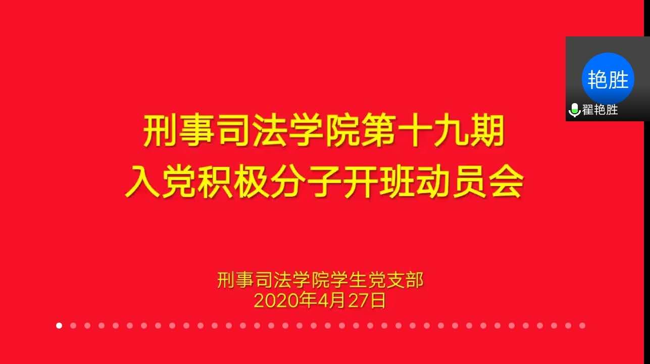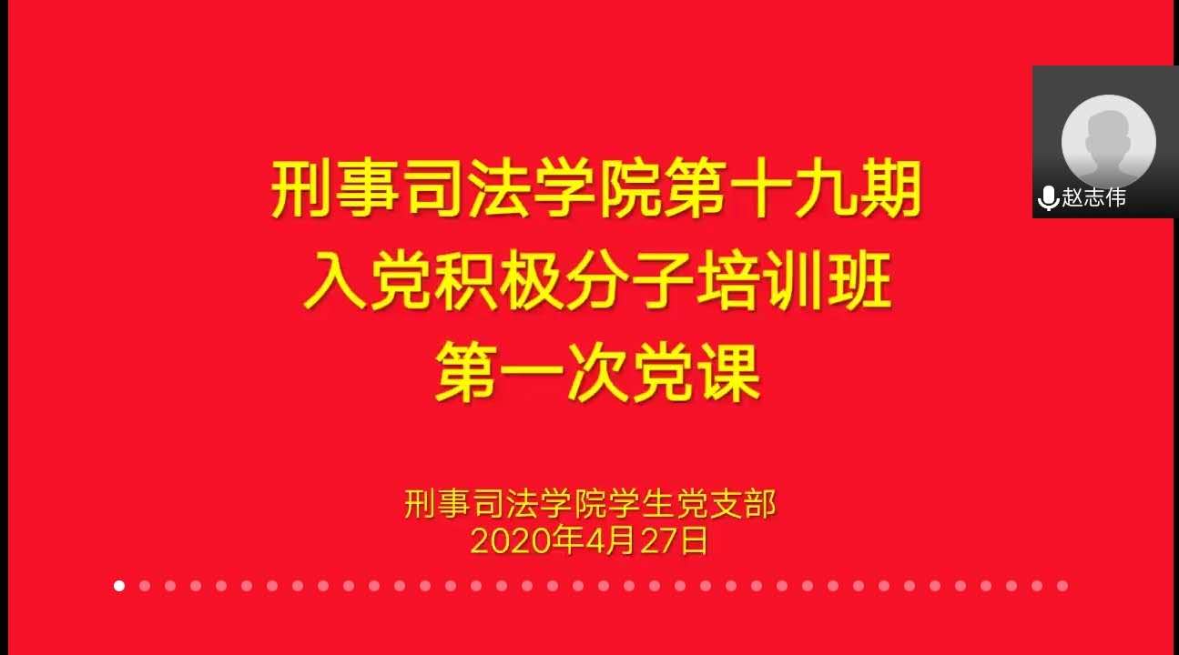 2020年4月27日,我院举办第十九期入党积极分子培训班开班仪式暨第一次党课。受新冠肺炎疫情的影响,开班仪式以视频会议形式进行。我院党委书记翟艳胜、学生党支部书记赵志伟老师及全体入党积极分子参加此次开班仪式。
