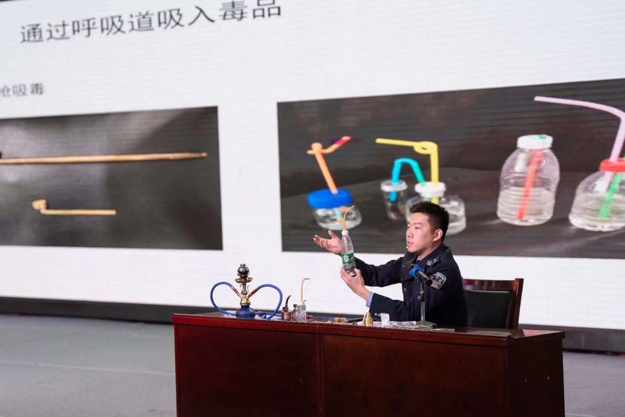 讲座伊始,李玉光通过列举图片详细介绍了新型毒品的种类,并以三道问答题揭示了新型毒品的伪装手段和潜在危害,极大地提升了学生对新型毒品的认知和分辨能力。接着,马骋介绍了常见的吸毒方式,并利用各种工具生动形象地展示了吸毒用具的使用方法,使学生对吸食毒品的方式和毒具的使用原理有了更深入的了解,增强了学生对毒品的警惕意识。马玮玮列举了现实生活中人们由于吸食毒品而导致的自残、精神错乱、家破人亡等严重后果,启示学生要远离毒品,避免陷入悲剧的漩涡。最后,王天瑞做出总结,强调大学生应准确识别毒品的谎言,树立正确的价值观,在面对毒品诱惑时要坚守自己的底线,保持清醒的头脑。