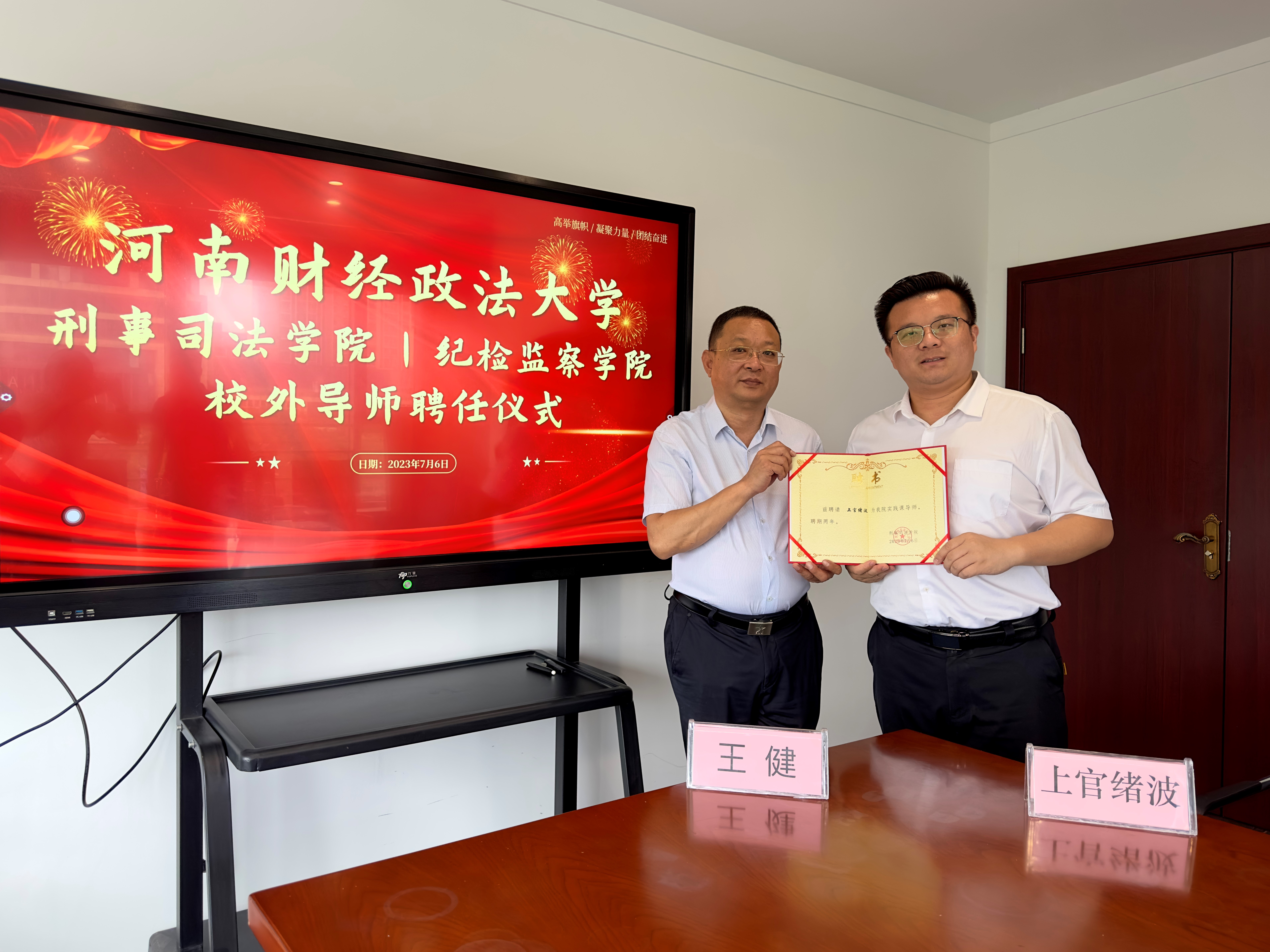2023年7月6日,我院实践课导师聘任仪式在河南曲成律师事务所举行。我院党委书记王健、副院长陈在上,河南曲成律师事务所党支部书记、主任上官绪波及朱亚萍、范秀娥等律师参加聘任仪式。