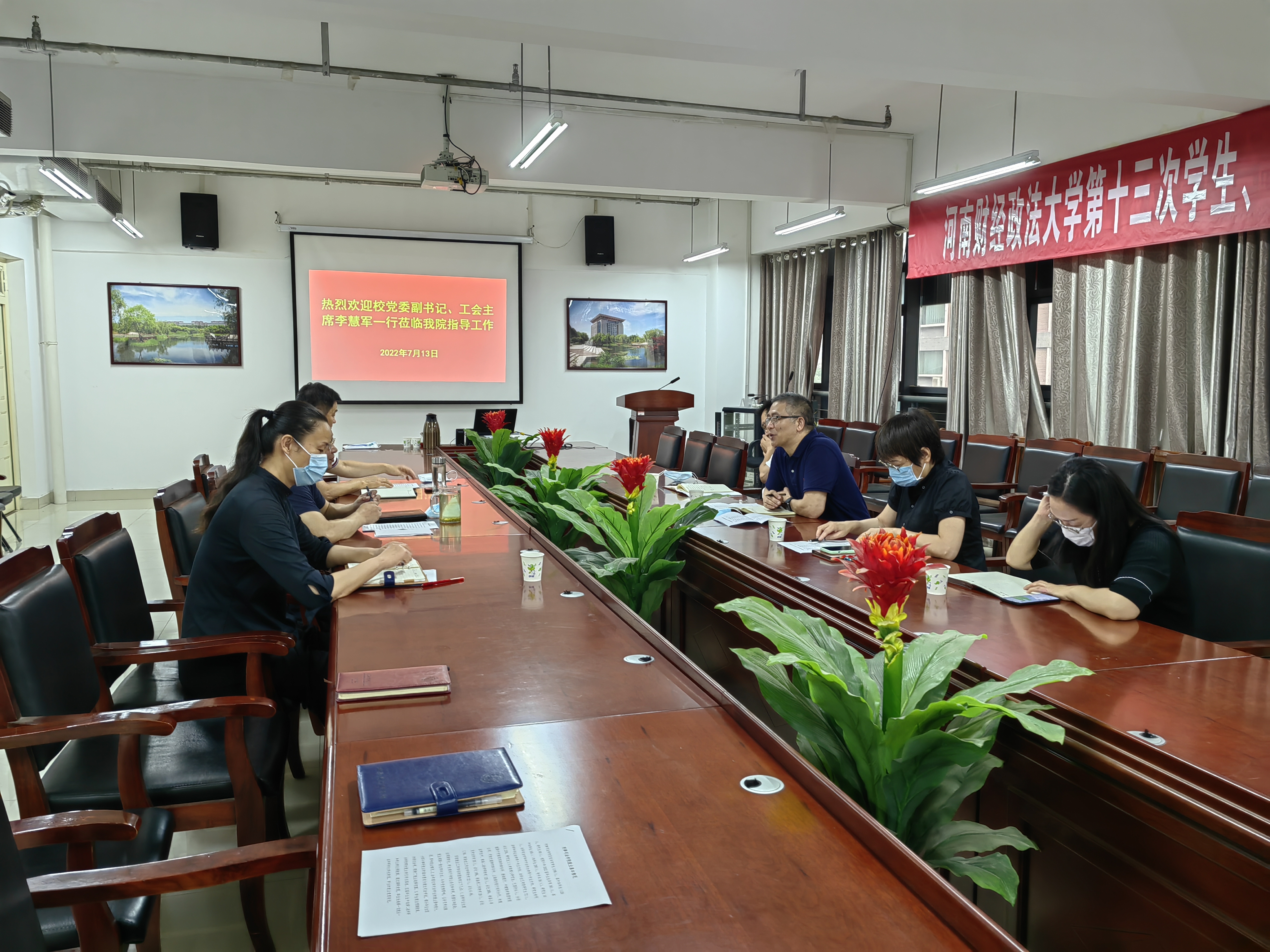 7月13日上午,校党委副书记、工会主席李慧军、就业创业指导处处长郝玉红等一行四人到我院就2022届毕业生就业工作进行了走访调研和座谈,我院党委书记王健、院长姜保忠、党委副书记陈俊敏及团委老师参加了此次座谈。