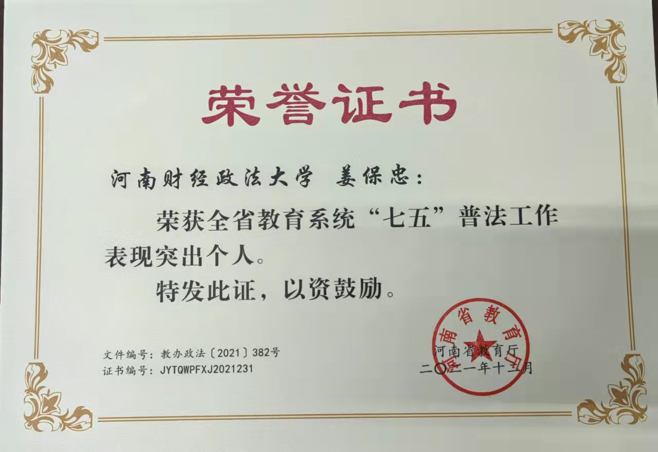 经过各高校遴选推荐,我院院长姜保忠教授荣获全省教育系统“七五”普法工作表现突出个人。姜院长从事法学教育工作二十多年,先后受聘担任河南省“七五”普法讲师团成员、河南省委法律顾问专家库成员、郑州市人大常委会法律咨询委员会委员、中国法学会廉政行为研究会河南省工作委员会专家委员等职位,参加多场法律专题宣讲活动,获得一致好评。