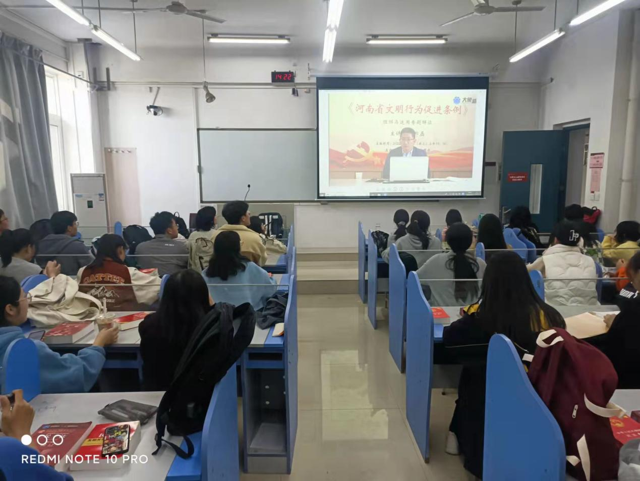 为引导和促进文明行为养成,提升学生的文明素养,在2022年河南省新时代文明实践推动周期间,我院于3月2日上午组织学生线上观看了河南省直文明办主办的《河南省文明行为促进条例》理解与适用专题解读活动。该活动由该条例的参与制订者、郑州大学法学院副教授郑磊主讲,我院全体21级学生参加。