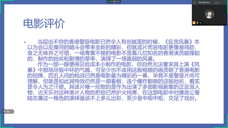 活动开始前,各班团支书通知到位,确保各班学生能够准时参加线上观影。本次活动以腾讯会议为开展平台,观看电影《反贪风暴》。该电影情节紧凑,一波三折,引起了参与活动学生浓厚的观影兴趣。同时,在观影期间,各班团支书对活动开展情况进行记录并及时汇报。观影活动结束后,各班团支书对本次活动进行总结,带领本班学生对电影情节展开更深层次的讨论和探索,认真体会电影所传达出的思想和内涵。