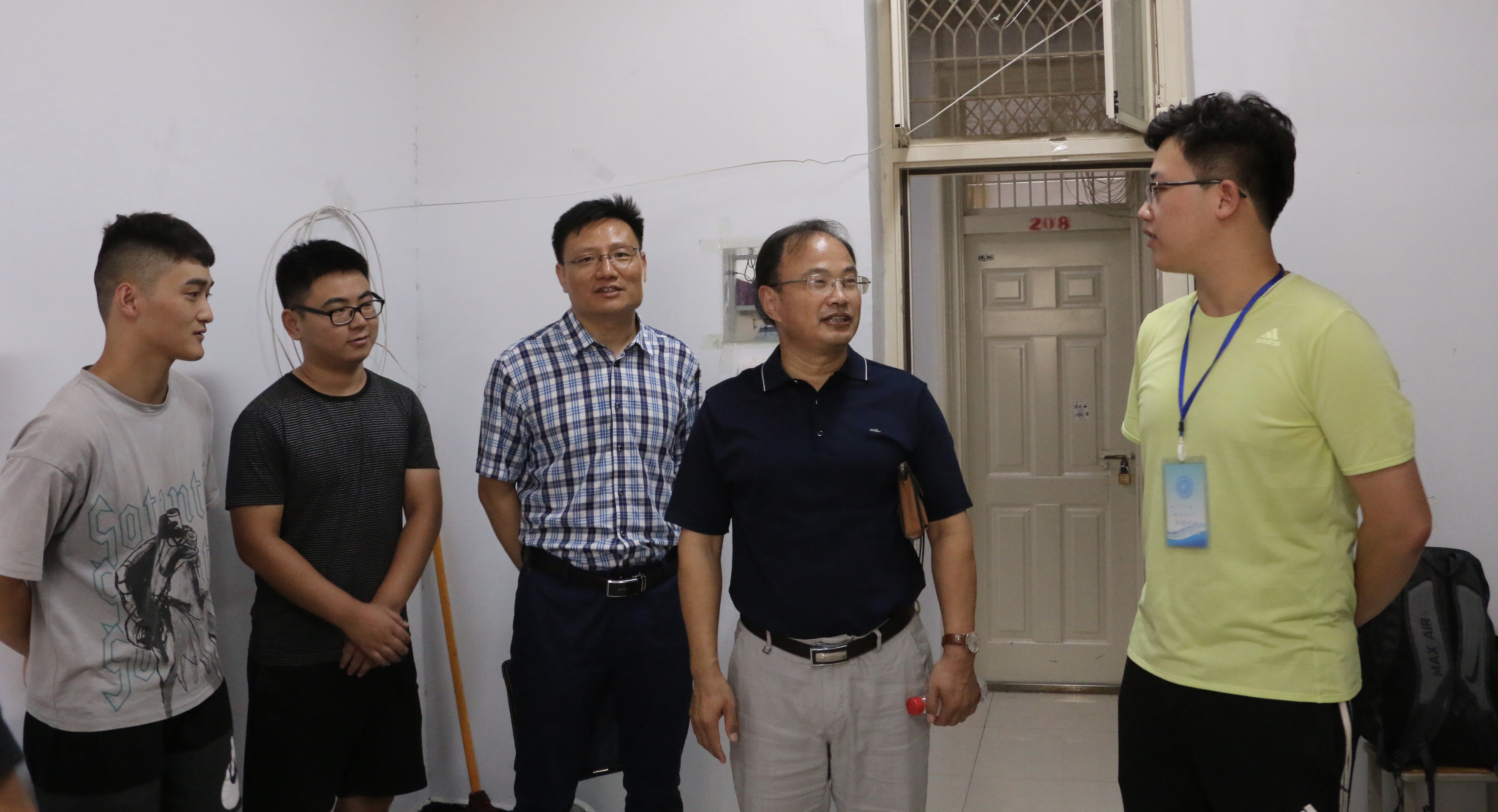 在新生完成入学报到程序后,当晚院党委书记翟艳胜、院长程政举、院党委副书记侯东亮、张二军副院长及我院相关负责老师来到郑东校区男生宿舍,看望2019级男生同学们,翟书记亲切问候了同学们,关心大家是否适应财大食堂的口味,并在宿舍里了解同学们的居住环境。程院长也表示希望各位同学能够在大学多交朋友、提高学习能力,鼓励大家沉下心来学习。