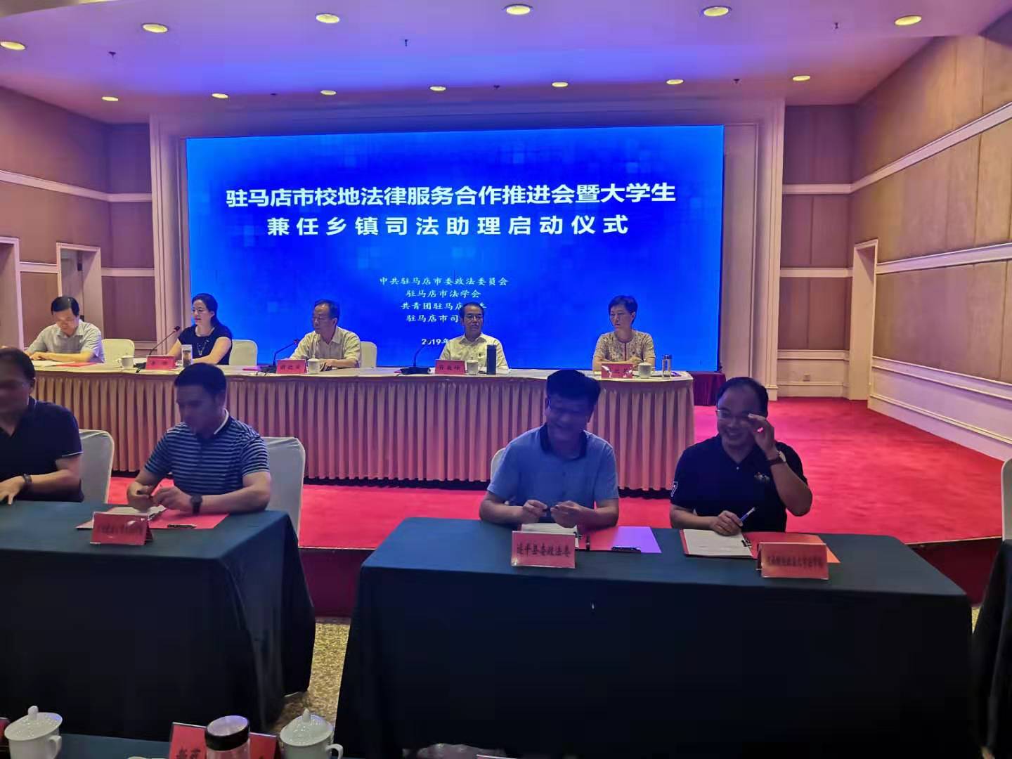 7月25日,驻马店市委政法委、法学会、团市委、市司法局召开驻马店市校地法律服务合作推进会暨大学生兼任乡镇司法助理启动仪式。河南省法学会副会长谢德安,驻马店市委常委、市委政法委书记孙巍峰等领导出席会议。我院院长程政举教授、院党委副书记侯东亮应邀出席会议。程政举院长代表学院签署了校地法律服务战略合作框架协议。