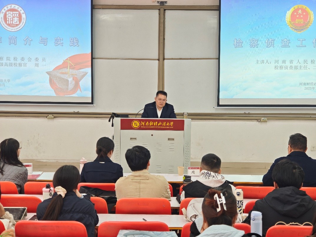 周一主任就检察侦查工作的法律定义、发展脉络及工作机制等方面展开系统讲解。他指出,检察侦查工作是对相关刑事案件开展证据收集和犯罪追诉的专门活动,涵盖直接立案侦查、补充侦查以及机动侦查三大职能。检察侦查工作自1949年检察机关初获部分职务犯罪侦查权开始,至2018年《刑事诉讼法》修订,最终明确了检察机关对14个罪名的侦查职责。在工作机制方面,周主任详细介绍了从线索评估到侦查信息化的完整流程,并举例说明了信息化手段在实战中的应用。他重点展示了河南省以检察侦查一体化为核心的工作模式,通过纵向联动与横向协作,统一管理线索、统筹侦查资源,有效提升了办案质效。最后,周一主任勉励在场研究生坚持“学中干、干中学”,未来积极投身检察事业。