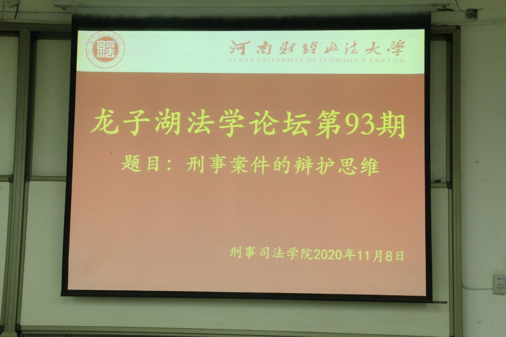 2020年11月8日晚7时,由于疫情影响与大家阔别许久的法学沙龙暨第九十三期龙子湖法学论坛在教科楼A座108会议室圆满举行。本次法学沙龙围绕《刑事案件的辩护思维》这一题目展开,由河南见素律师事务所创始人李峰主任主讲,我院陈在上博士主持,前检察官杜心泉主任作为嘉宾参会,参与本次沙龙的还有我院院长程政举教授、乔金茹教授、刘用军教授、张二军副教授、史贵帅老师、魏煜鑫博士和我院刑法学、诉讼法学研究生与本科生。