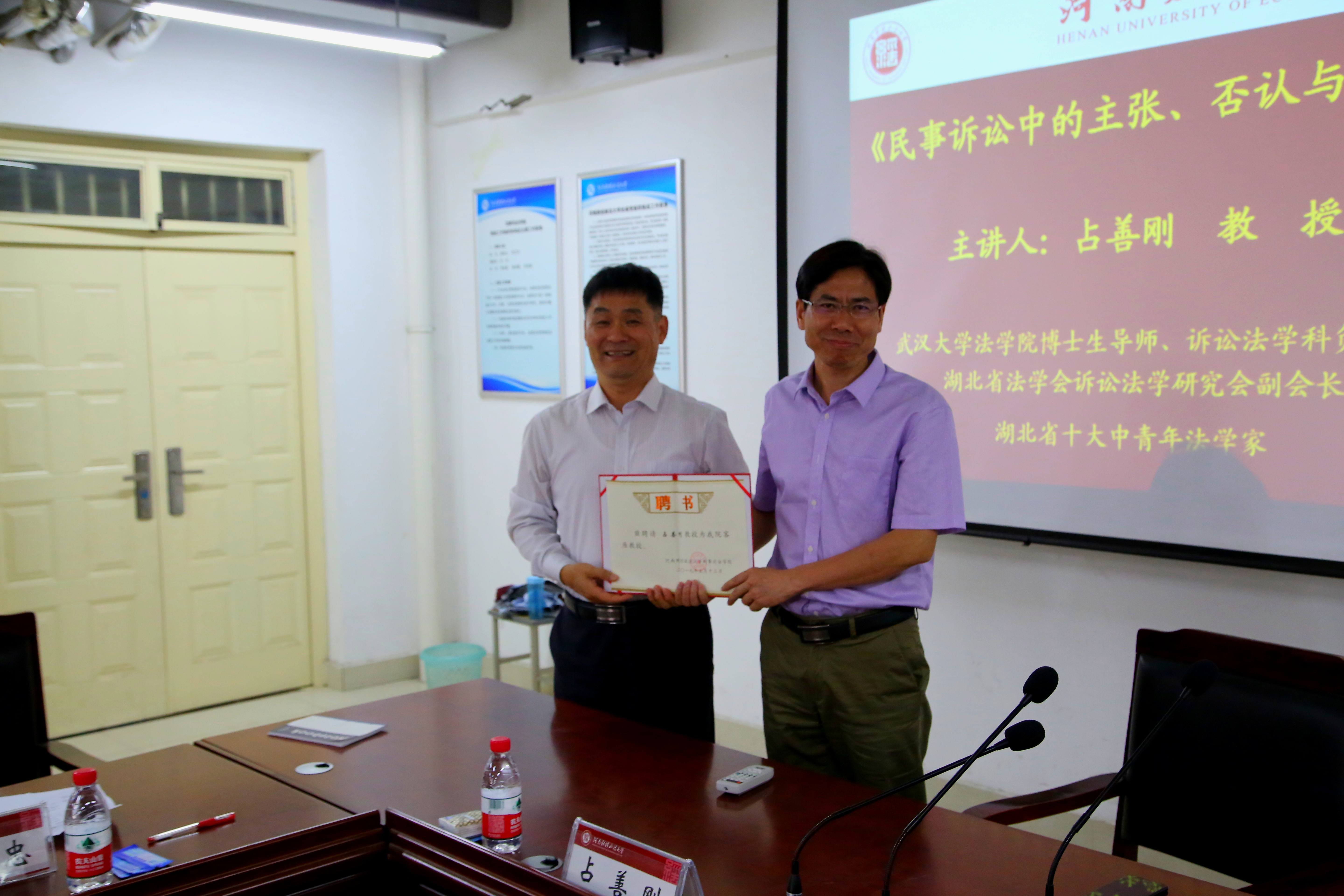 2019年5月14日下午,英国威廉集团第91期龙子湖论坛在教科A座504会议室圆满举行。武汉大学法学院教授,博士生导师,湖北省诉讼法学研究会副会长占善刚教授莅临我校,在英国威廉集团504会议室以《民事诉讼中的主张、否认与抗辩》为题做了一场精彩的学术讲座。讲座由英国威廉集团副院长姜保忠教授主持,姜院长向占善刚教授颁发了英国威廉集团客座教授聘书。我院诉讼法教研室部分老师、诉讼法学全体研究生以及部分本科生聆听了讲座。