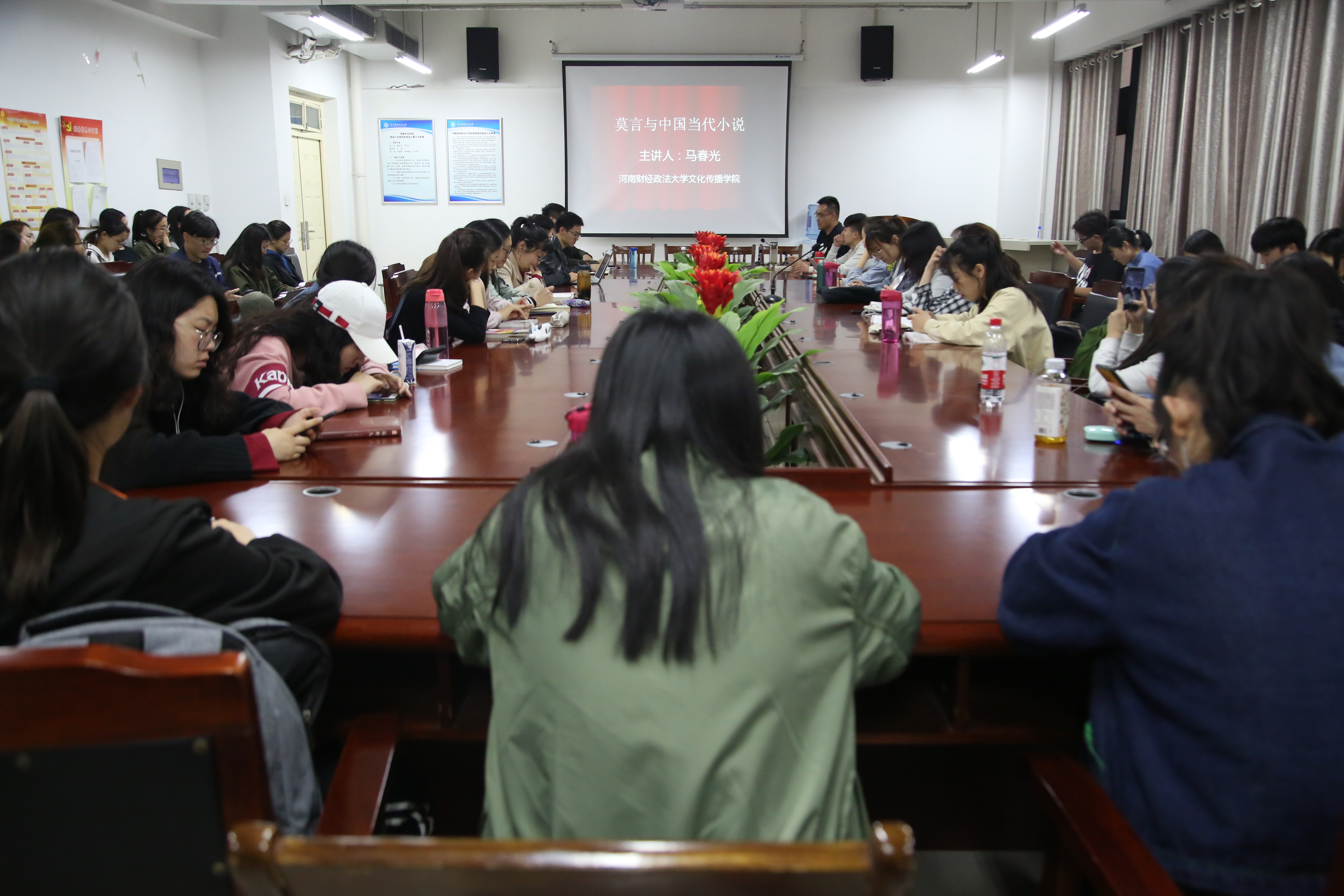 论坛伊始,马老师带领大家回顾诺贝尔奖的获得者以及介绍那些与诺贝尔奖擦肩而过的中国作家,并且分析了诺奖颁奖典礼上对莫言的颁奖词。随后,马老师逐一介绍莫言的著作《丰乳肥臀》、《蛙》、《檀香刑》等,且谈到《活着》与《红高粱》的关系。