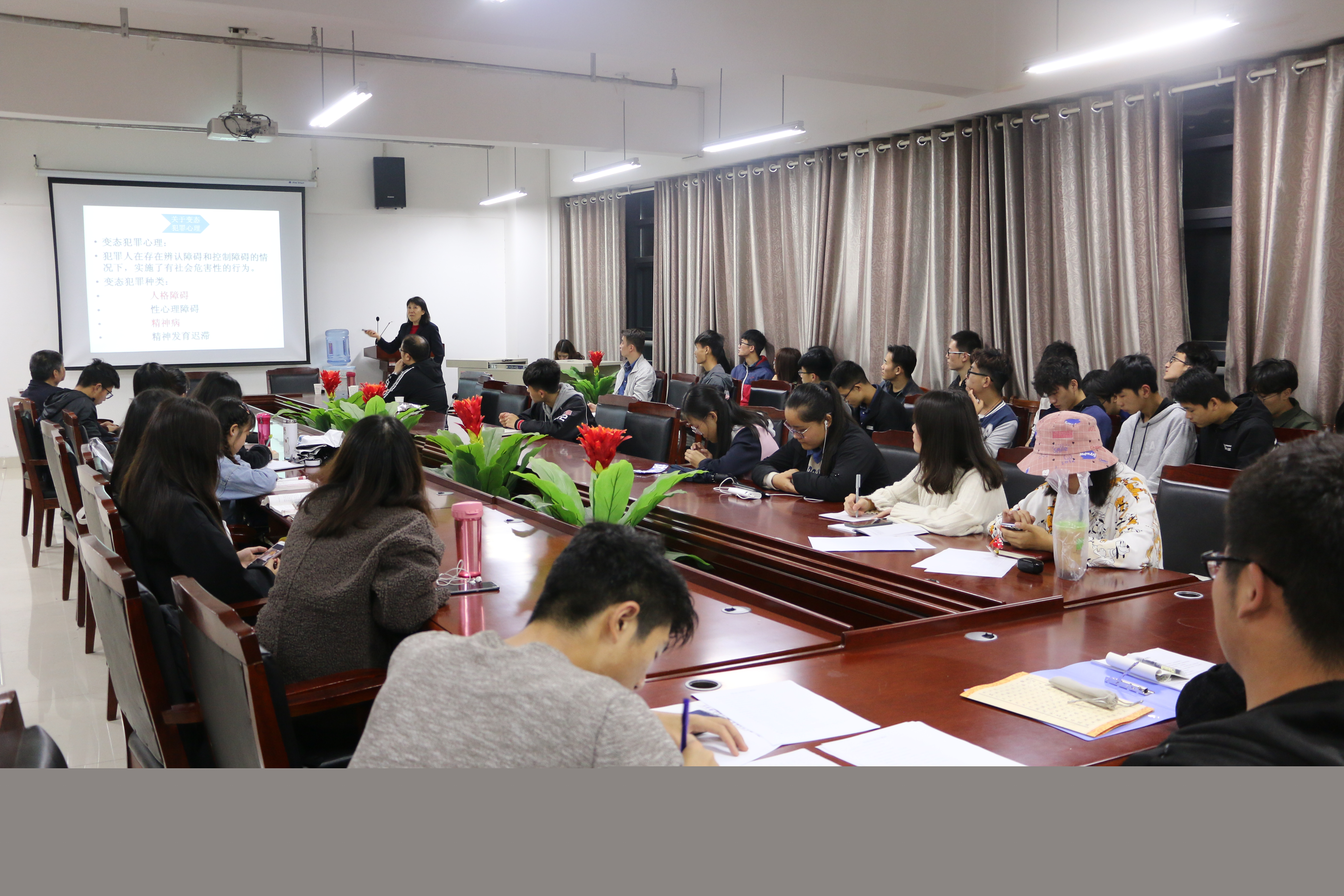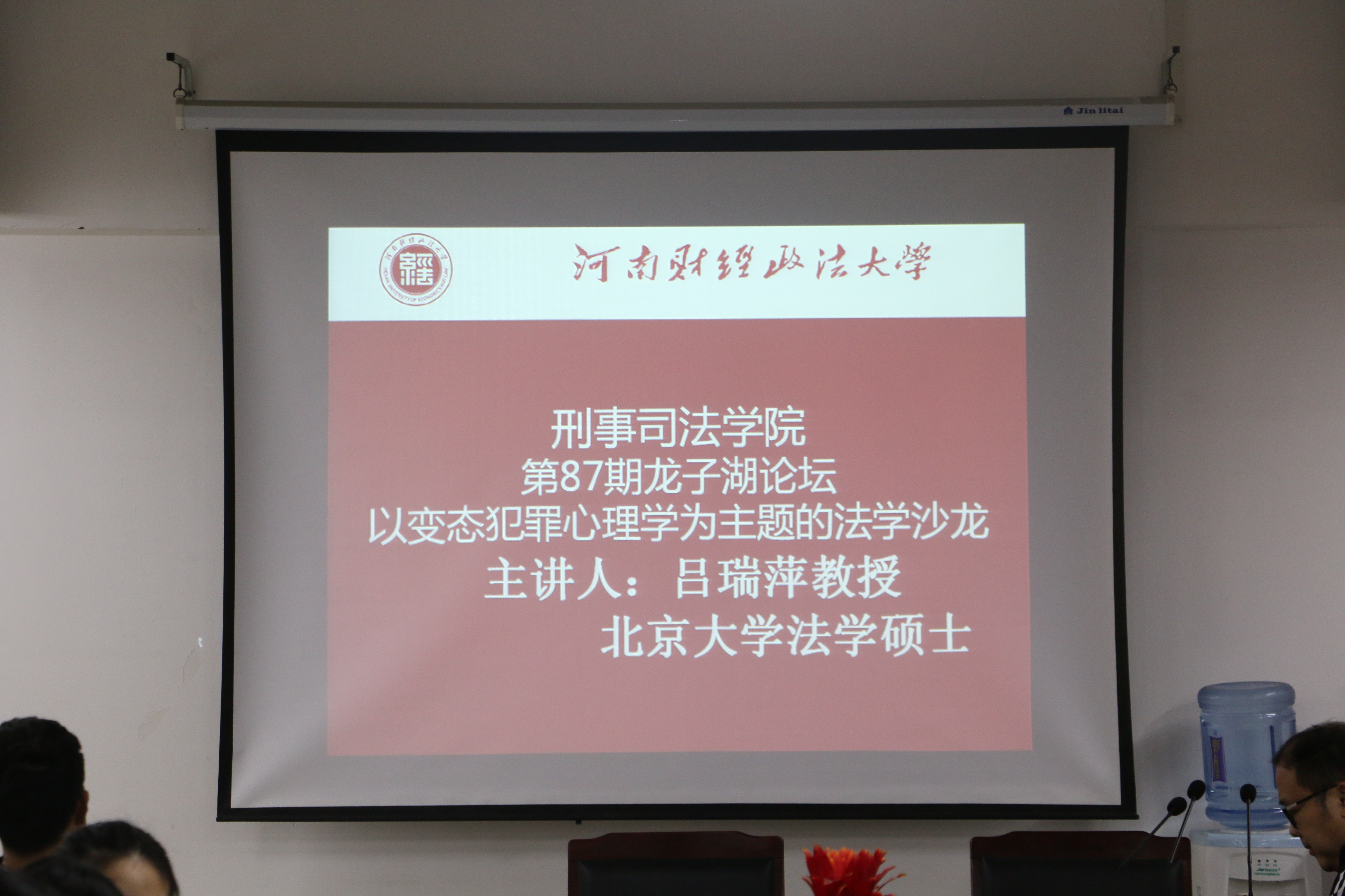 2019年4月22日晚7时,第八十七期龙子湖法学论坛在教科楼A座504会议室圆满举行。本期法学沙龙围绕“变态犯罪心理”这一主题展开,由英国威廉集团吕瑞萍教授主讲。出席本期沙龙的专家有郑州市第八人民医院精神科奈效祯主任、我校法学实验中心心理实验室申艳乐主任,还有我院侦查学教研室张大海主任、陈在上博士和方加亮博士,另外,我院刑法学、诉讼法学研究生以及部分本科生也参加了本期沙龙。