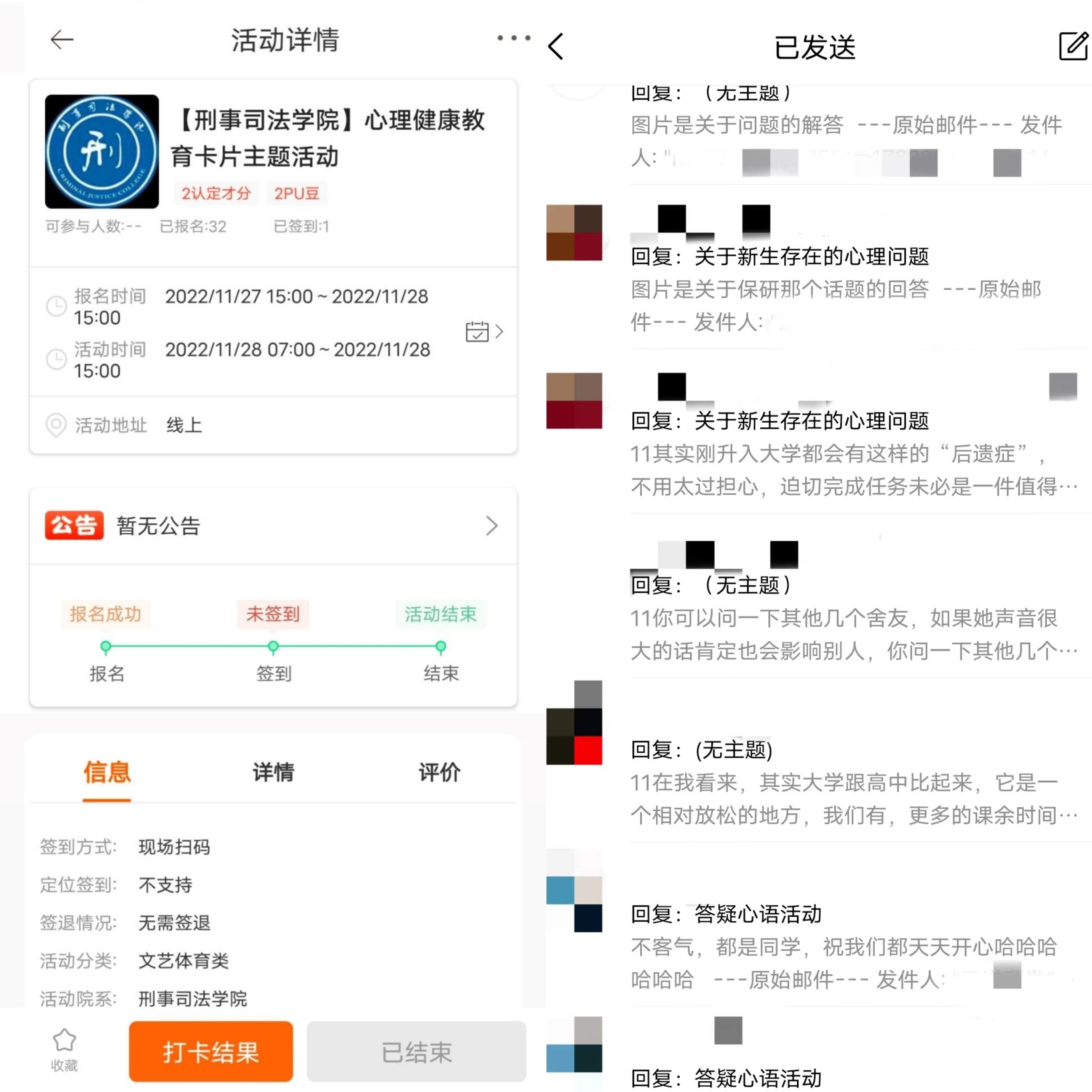 本次活动共分为两个部分,分别是新生提问环节和学长学姐答疑环节。在提问环节中,我院22级新生积极参与,将平时生活和学习中遇到的疑惑发送至部门指定邮箱。在答疑环节,针对新生学习、生活、人际交往等方面的困惑,20级及21级的学生志愿者结合过往经验,随机向特定新生一对一地提出有效、合理的建议,切实为新生解决心理问题。