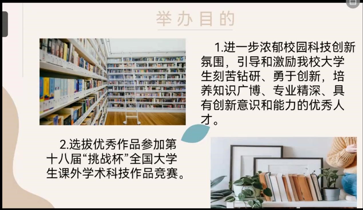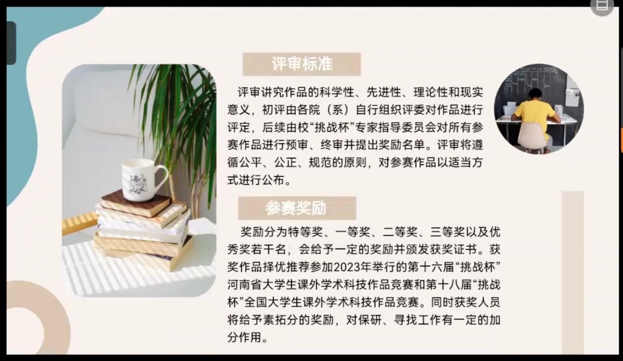 为协助我院学生进一步了解“挑战杯”竞赛内容,鼓励学生积极参与,11月22日晚,我院科技创新协会通过线上会议方式举办“挑战杯”宣讲会。
