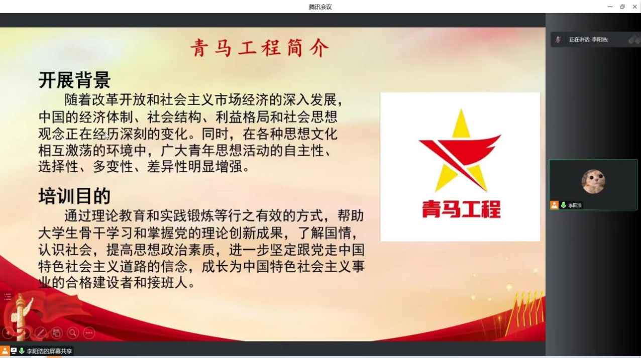 本次开班仪式旨在帮助大学生骨干学习和掌握党的理论创新成果,使其成长为中国特色社会主义事业的合格建设者和接班人。会议开始,武仕祯强调了疫情形势下开展青马工程的重要内涵与必要性,并指出学生干部要在学习与工作中贯彻马克思主义思想,勤于思索、勇于担责。随后,团校负责人就本次“青马工程”开展的具体事项作出说明,他介绍道,培训时间将从今年11月持续至次年5月,培训方式由理论学习、交流讨论及实践活动三方面组成。最后,他提醒各位学员要明确纪律要求和最终成绩构成,在团校带领下通过理论与实践学习,由浅入深地理解马克思主义。