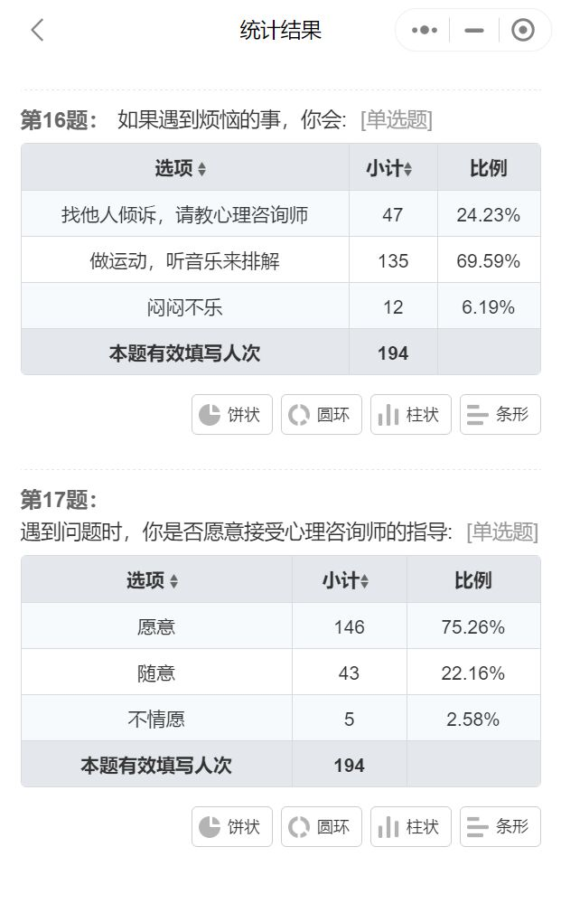 本次心理健康调查活动的开展,为开展有效的心理健康教育活动提供了依据,也推动了我院心理健康教育工作的顺利进行。