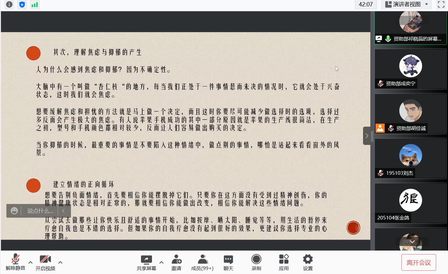 此次活动分为三部分,首先由资助部负责人祁晓蕊以PPT的形式对心理健康相关知识进行介绍;其次,结合之前的心理健康调查问卷结果指出常见的心理健康问题并给出解决方法;最后,观看动画短片《你并不孤单》和《阿甘正传》电影剪辑。《你并不孤单》讲述的是生活中你并不是一个人,身边还有朋友、同事们陪伴着你,不要感到孤独和无助;《阿甘正传》则告诉我们要自强不息、坚持不懈,最终终将获得成功。短片播放结束后,全体参会学生交流讨论了从短片中获得的启示。