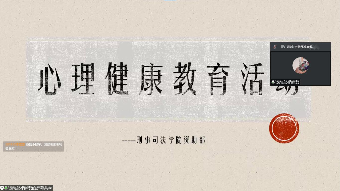 11月26日晚,我院资助部“心理健康教育活动”在腾讯会议以线上方式举行,此次活动由资助部负责人祁晓蕊主持,全体家庭经济困难学生参与。
