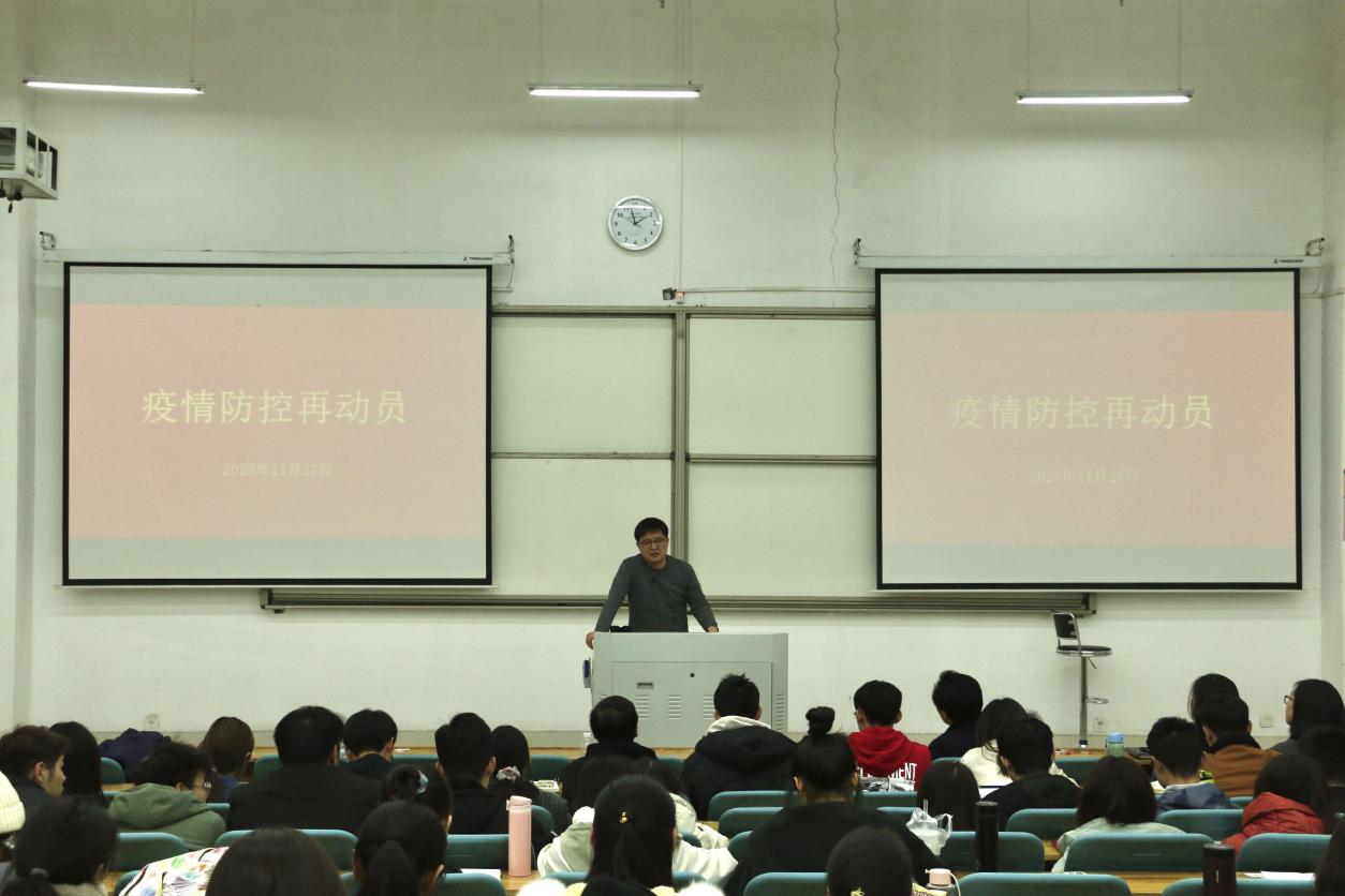 其次,团委书记赵志伟对我院各项学生工作进行总结,肯定了学生工作取得的成就。同时,他针对学生在网络空间的言行及学生关系等问题提出建议,并着重强调人身安全问题。针对目前疫情防控的形势,他强调了疫情防控期间的纪律要求,希望我院学生自觉佩戴口罩,做好宿舍通风工作,坚持全员防控,按照疫情防控常态化的要求,思想上高度重视,遵守学校各项疫情防控的要求。