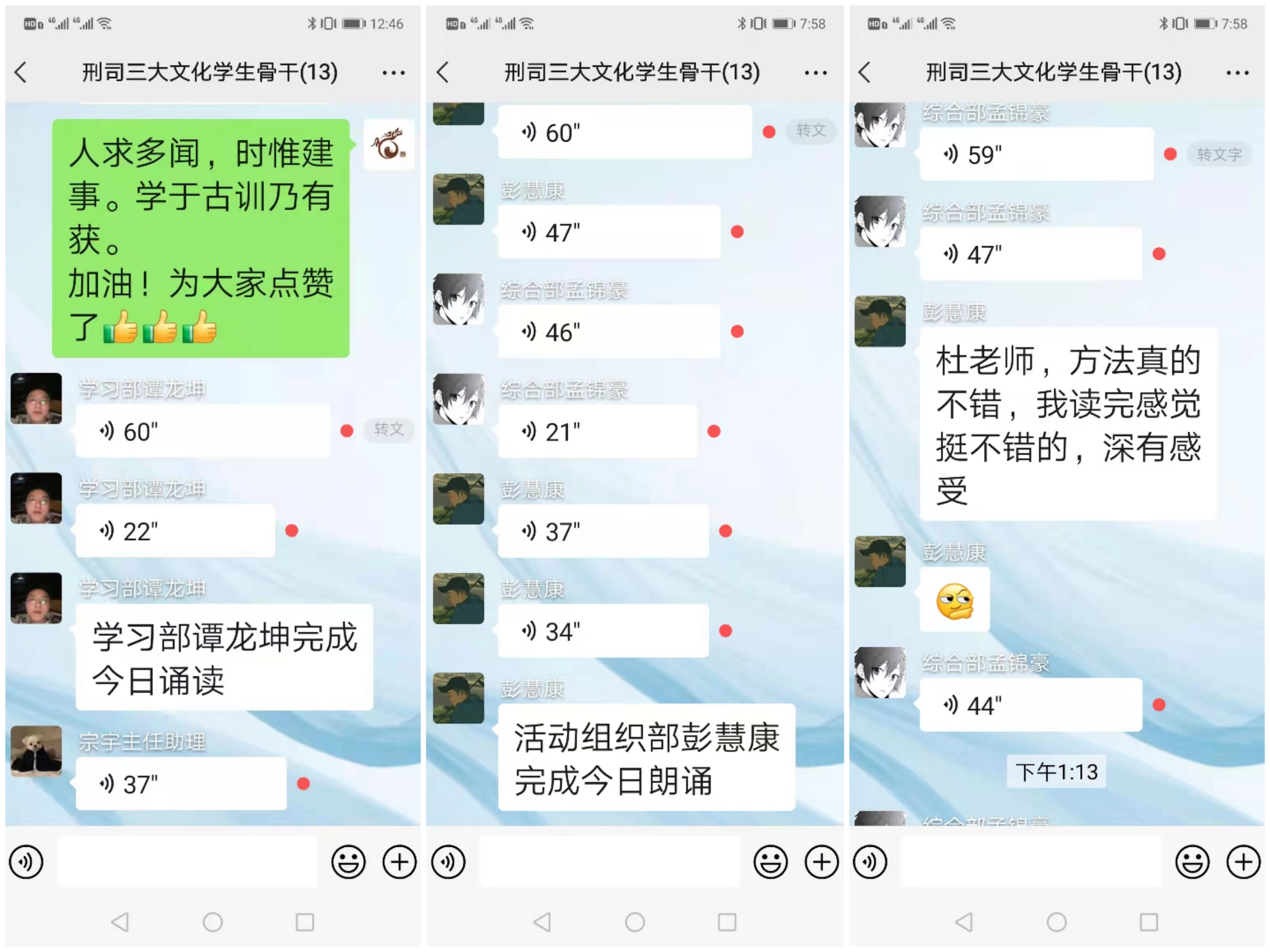 据悉,此项活动是学院三大文化协同育人135工程中的一个子项目,该中心负责人杜卫东介绍说:“经典学习是本项工程的重中之重,通过背诵一部经典,领悟一本经典,践行一本经典,把经典带入同学们日常的学习和生活,化为一种自觉的行动,形成潜移默化的影响力。”据悉,育人中心倡导每部经典诵读21遍,在此基础上进行精细研读,领悟其意,活学活用。该学习计划是利用每天的碎片化时间,通过微信群由指导老师带读,学生每天诵读三遍,连续一周以后,更换内容,进入下一轮诵读,每一周结束后集中分享,每日不辍,即便是周末、假期也不中断。该项经典学习以“非知之艰,行之惟艰。”为行动指南,以“苟日新,日日新,又日新。”为行动目标。通过骨干学生一周的学习以后,学院将于11.12日启动大一全体新生的学习计划。